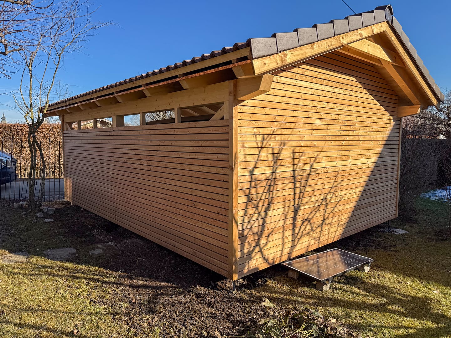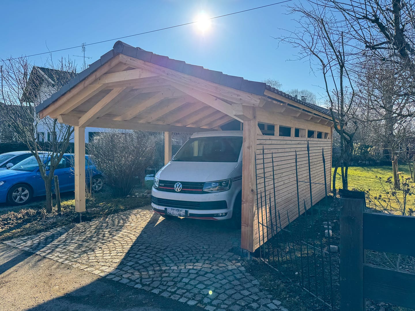 Für dieses Projekt haben wir einen maßgefertigten, hochwertigen Carport mit Außenschalung realisiert. Die Konstruktion wurde aus langlebigem und witterungsbeständigem Holz gefertigt, um einen zuverlässigen Schutz für Fahrzeuge zu gewährleisten.