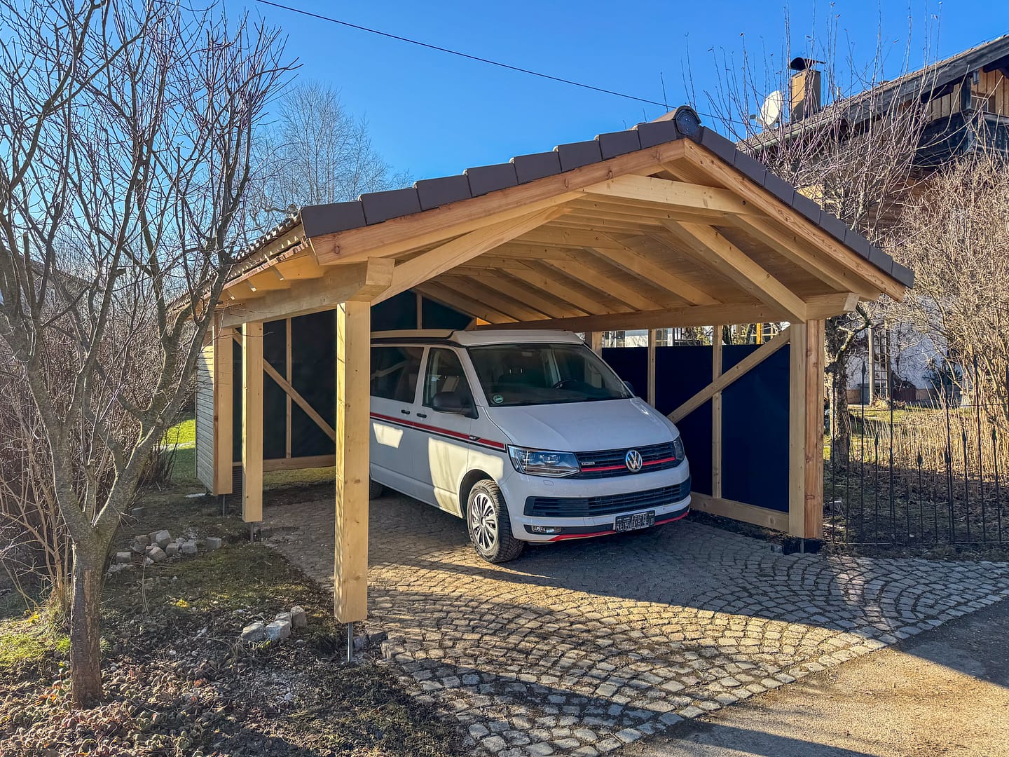 Für dieses Projekt haben wir einen maßgefertigten, hochwertigen Carport mit Außenschalung realisiert. Die Konstruktion wurde aus langlebigem und witterungsbeständigem Holz gefertigt, um einen zuverlässigen Schutz für Fahrzeuge zu gewährleisten.