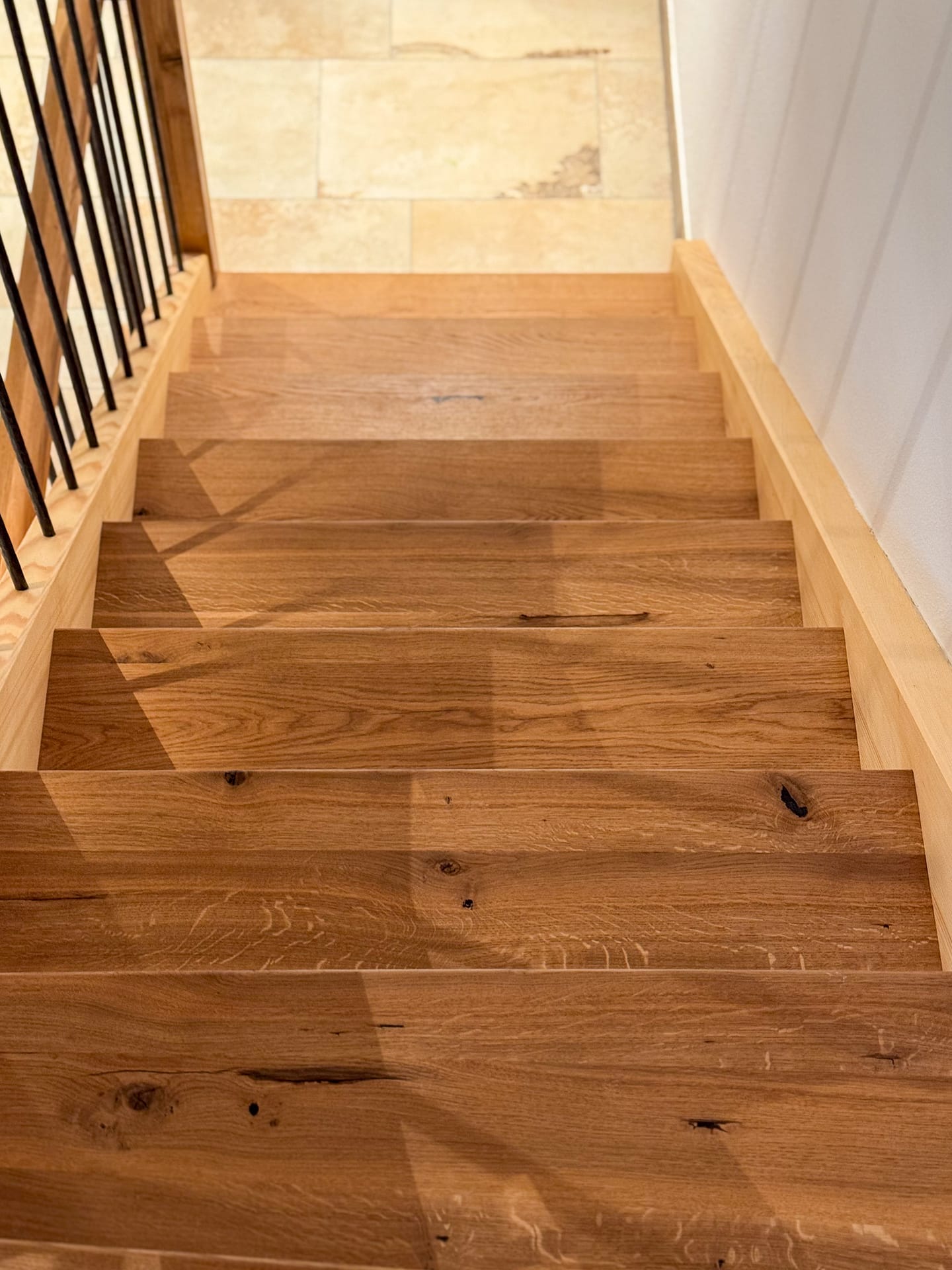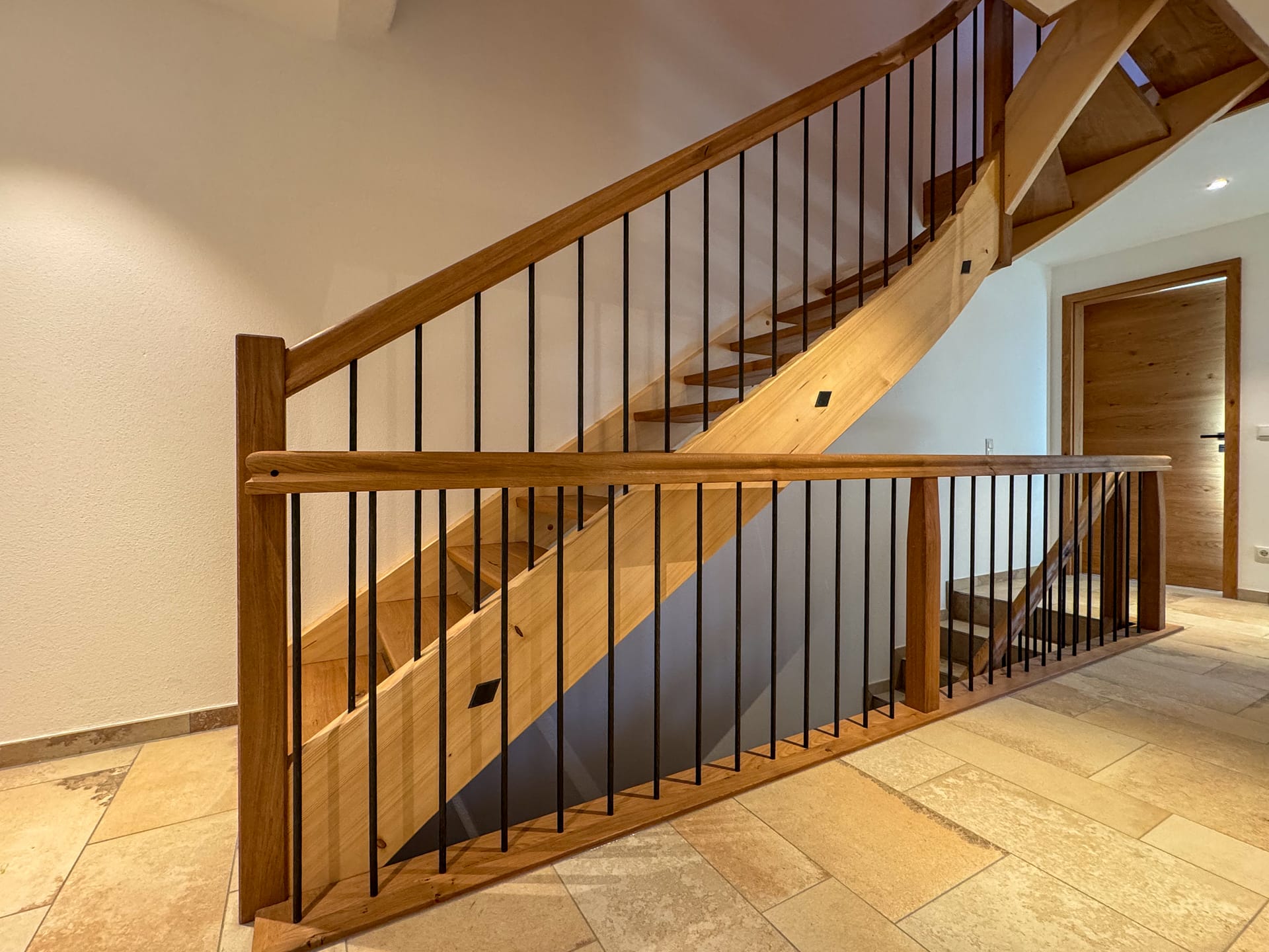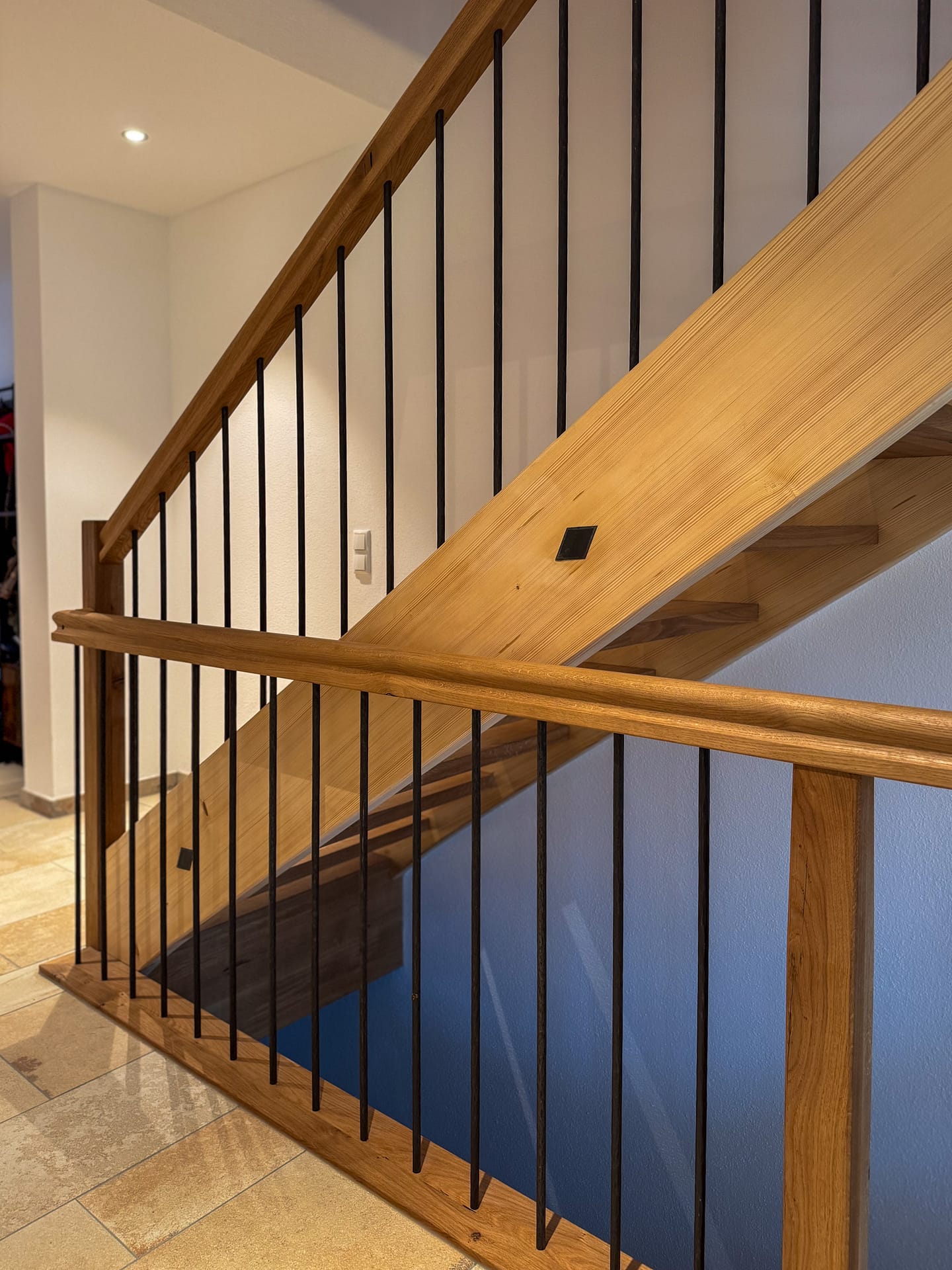 Für dieses Projekt haben wir eine maßgefertigte, moderne Treppe aus hochwertigen Materialien realisiert. Die Kombination aus warmem Eichen- und Buchenholz mit modernen Metallelementen sorgt für eine stilvolle und langlebige Konstruktion.
